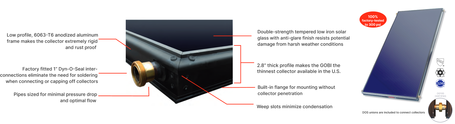 The GOBI flat plate collector, featuring a high selective full plate absorber, leads the industry in performance. Its redesigned frame and advanced components ensure a sleeker profile and enhanced efficiency. Offering options for diverse solar water heating needs, the GOBI ranks among the top OG-100 collectors, delivering maximum energy output. The collectors are pressure tested to 300 PSI for durability and reliability. Streamlined design features include reduced frame thickness, improved insulation, and effortless installation with Dyn-O-Seal (DOS) union interconnection.